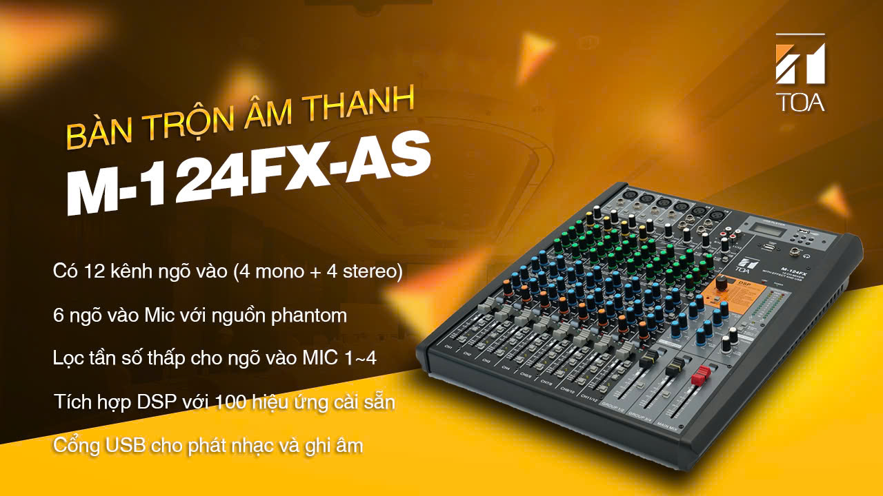 M-124FX-AS là bàn trộn âm thanh dạng tương tự (analog) phù hợp cho các ứng dụng vừa và nhỏ như nhà thờ, phòng đa năng hoặc phòng họp. Bàn trộn bao gồm 12 kênh ngõ vào và hiệu ứng DSP với 100 hiệu ứng cài sẵn, nhờ đó thiết bị không chỉ là sự lựa chọn lý tưởng cho môi trường chuyên nghiệp, mà dễ dàng sử dụng ngay cả với người dùng không chuyên. Bàn trộn không chỉ đáp ứng nhu cầu cho các ứng dụng phát biểu cần độ rõ nét cao mà còn cho cả biểu diễn âm nhạc trực tiếp. Bên cạnh các hiệu ứng DSP ưu việt, M-124FX-AS còn được trang bị cổng USB dành cho chức năng ghi âm.